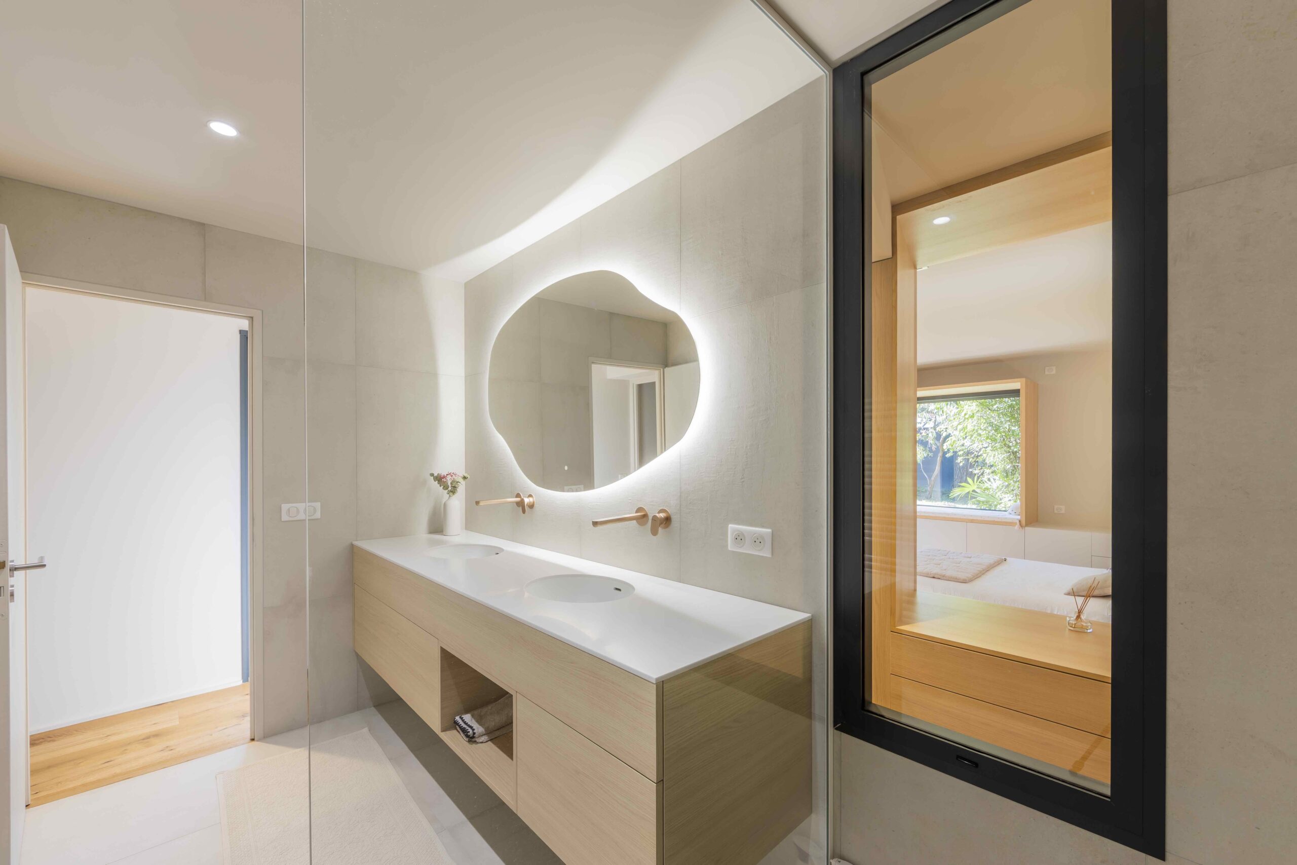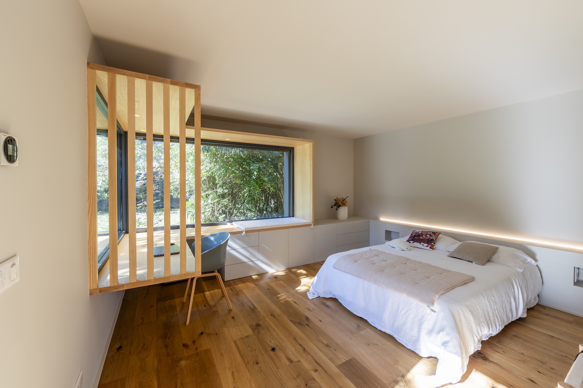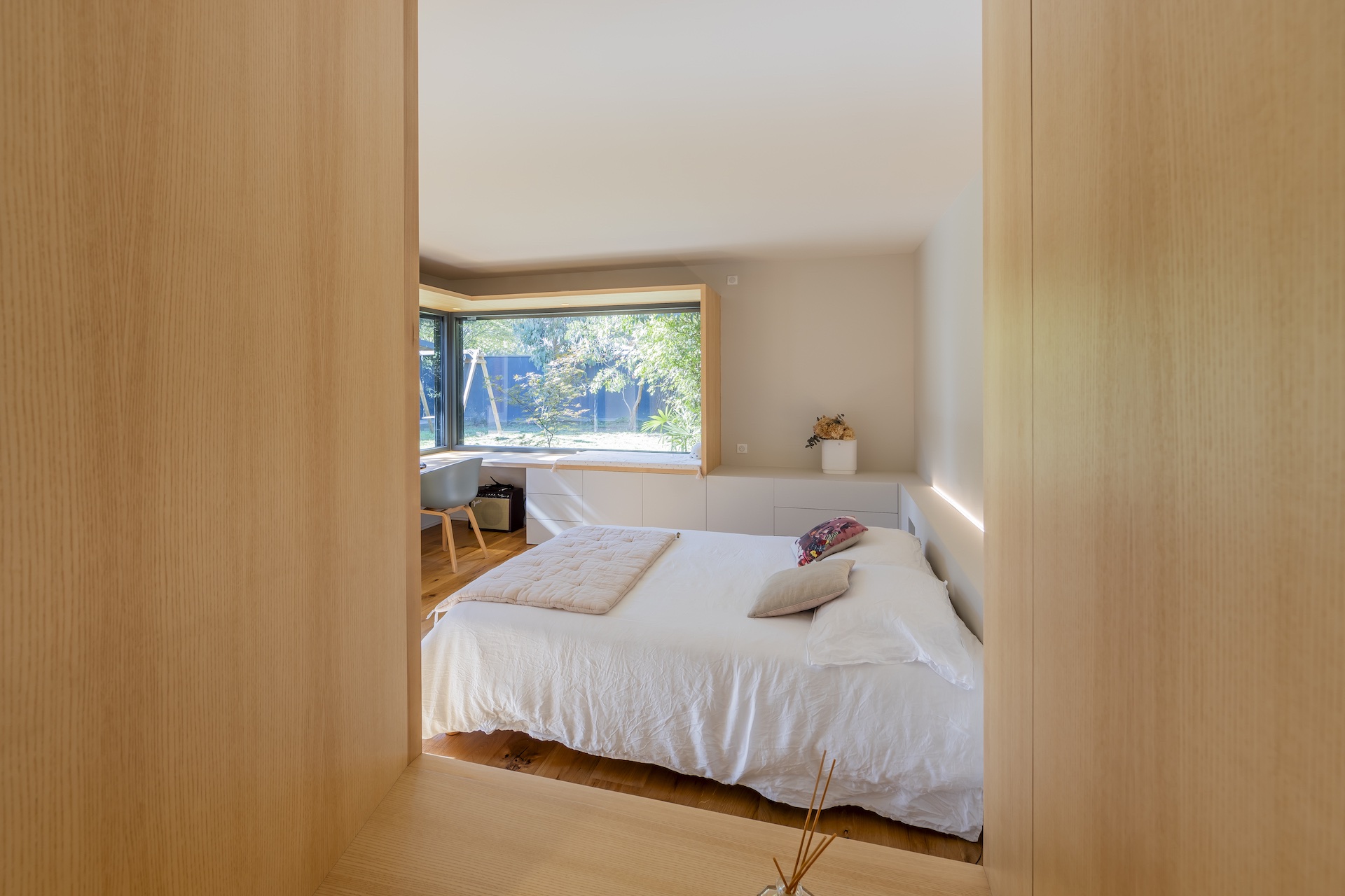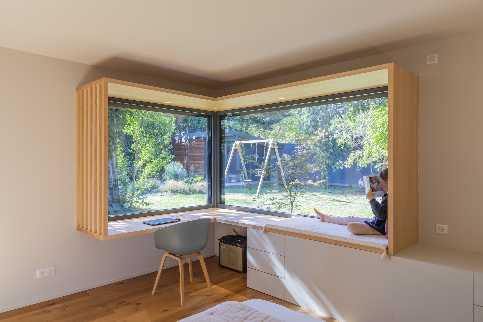 Pensée comme une expérience visuelle et sensible, la chambre se déploie jusqu’à une baie d’angle bois suspendue, ouvrant un bureau sur la verdure. Des traversées visuelles relient intérieur et extérieur, accentuant la profondeur et la fluidité des espaces.