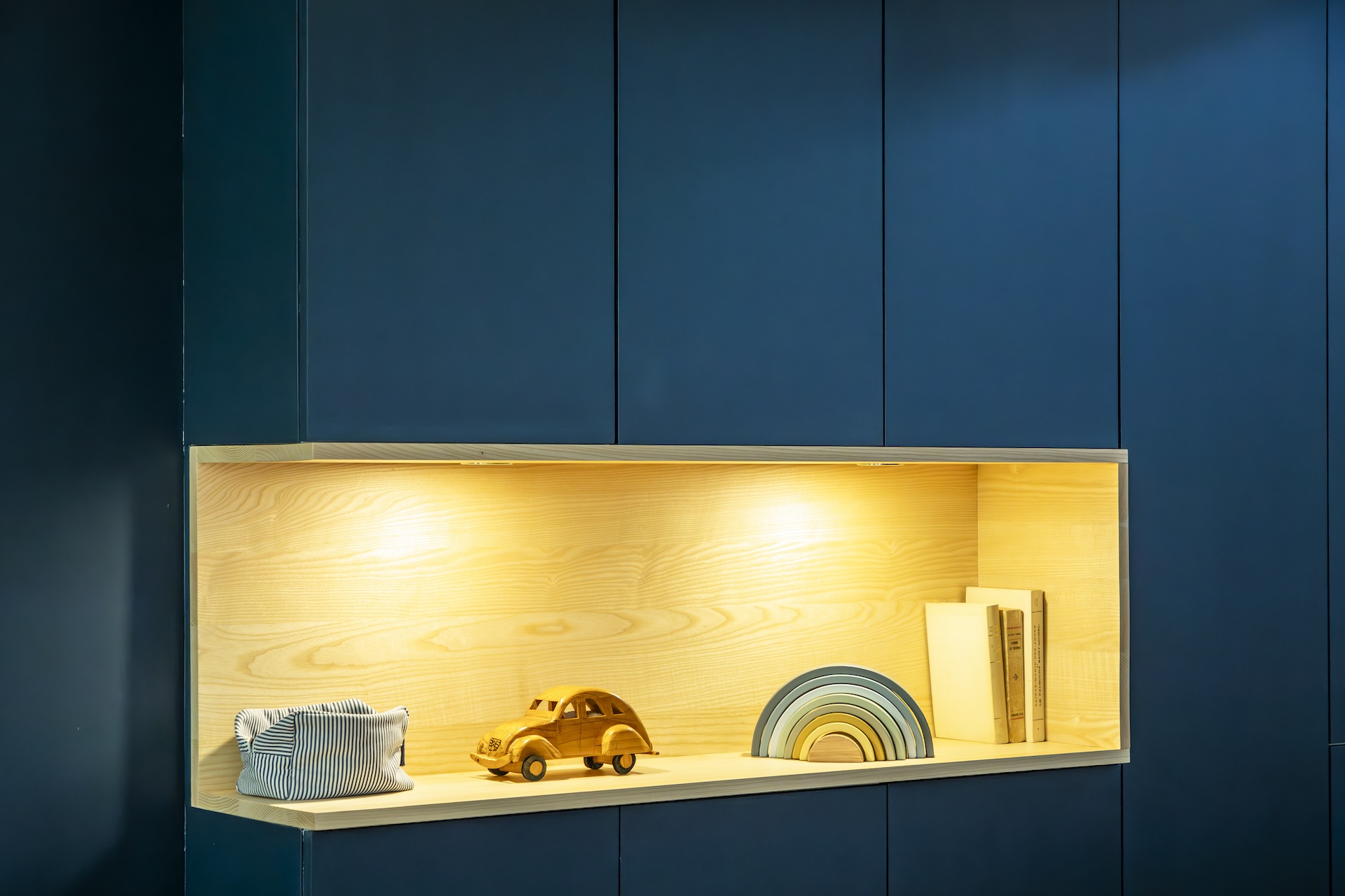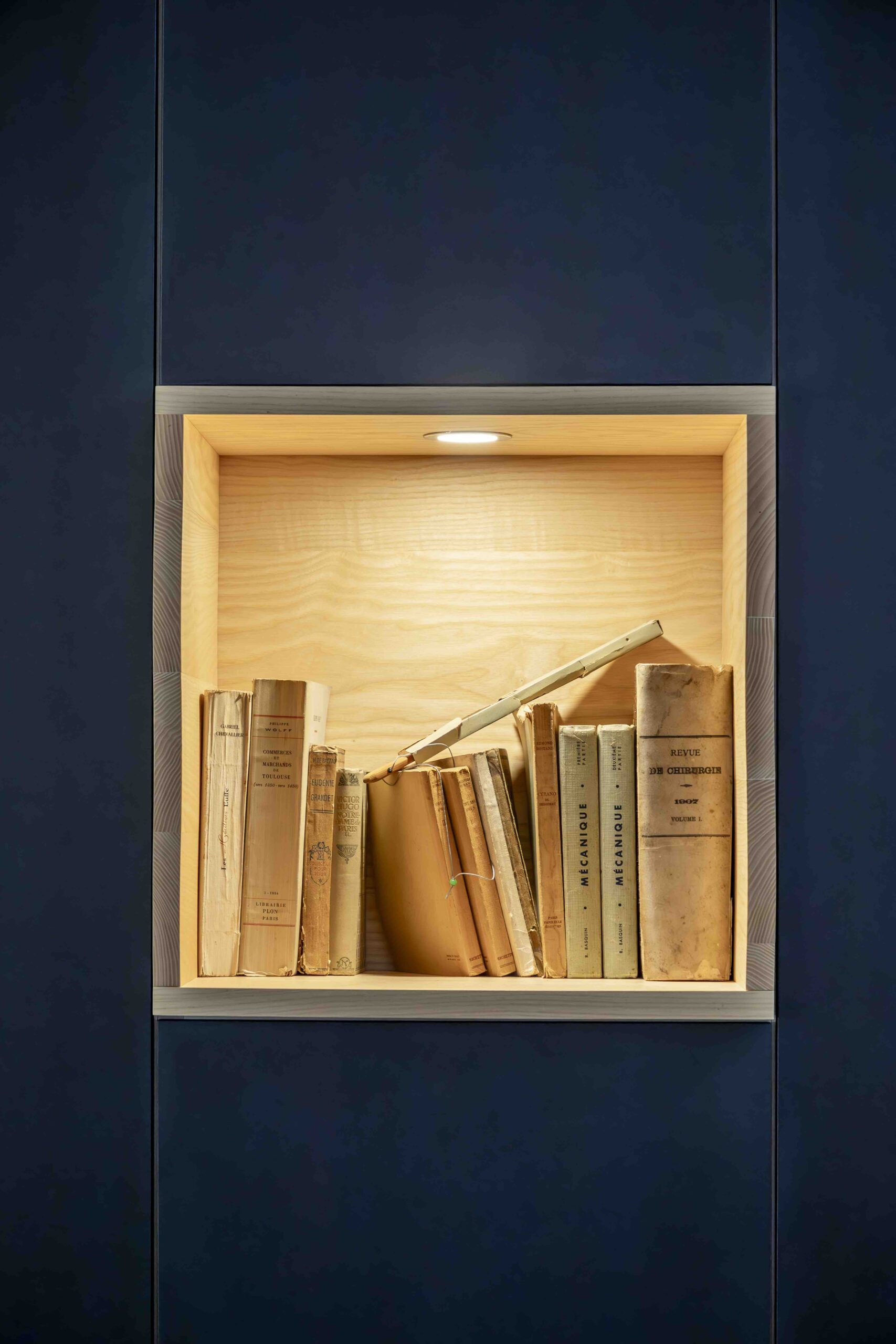 A l’articulation entre ancien et nouveau, un mur bleu nuit du salon accueille une bibliothèque en frêne, écho aux matières naturelles et aux teintes chaleureuses qui unifient l’ensemble.